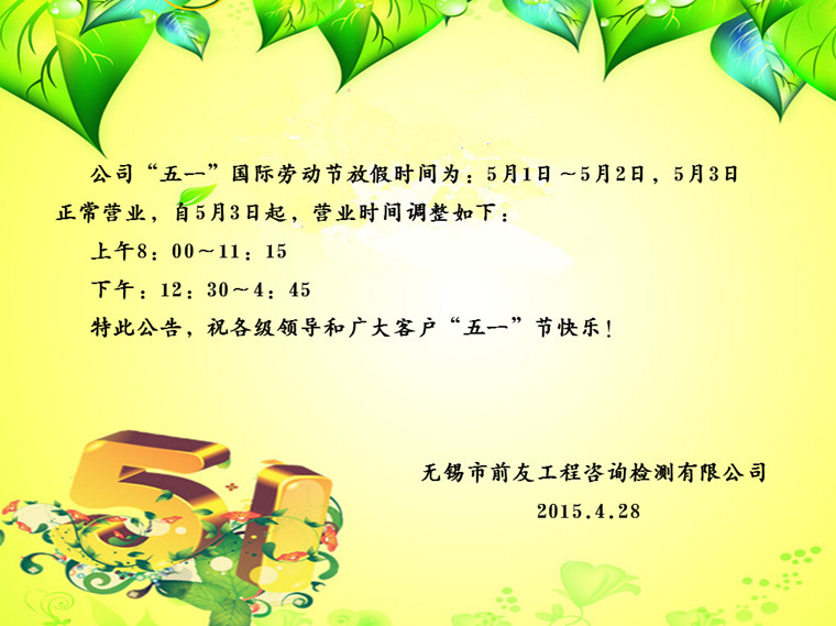 | 關(guān)于“五一”節(jié)放假及節(jié)后營業(yè)時間調(diào)整的公告 | ||