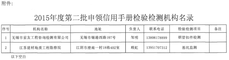 據(jù)悉,無錫市建設工程安全監(jiān)督站發(fā)出錫建安監(jiān)【2015】24號文“關于公布2015年度無錫市第二批申領建設工程安全類檢驗檢測機構信用手冊名錄的通知”。 為加強我市建設工程安全類檢驗檢測的管理,根據(jù)《無錫市建設工程安全類檢驗檢測機構信用管理辦法》,經(jīng)各檢測機構自主申報,市安監(jiān)站組織對2015年度申報的第二批建設工程安全類檢驗檢測機構進行了資料核查,將經(jīng)核查符合條件的建設工程安全類檢驗檢測機構名錄予以公布。