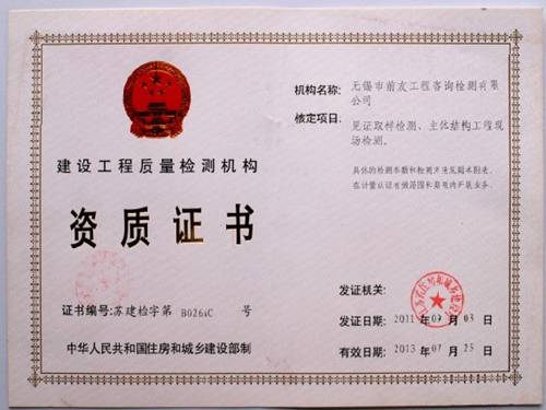 近日,從江蘇省住房和城鄉(xiāng)建設(shè)廳行政審批公告(蘇建審批公告(2011)第0154號(hào)文獲悉),無錫市前友工程咨詢檢測(cè)有限公司已順利通過建設(shè)工程檢測(cè)機(jī)構(gòu)資質(zhì)審查,核準(zhǔn)資質(zhì)的項(xiàng)目和類別包括:見證取樣檢測(cè)A、主體結(jié)構(gòu)工程現(xiàn)場(chǎng)專項(xiàng)檢測(cè)C、建筑節(jié)能工程專項(xiàng)檢測(cè)(備1)、室內(nèi)環(huán)境備案類檢測(cè)(備3)、建筑水電備案類檢測(cè)(備6-1)、墻體材料備案檢測(cè)(備7)、飾面材料備案類檢測(cè)(備8)、防水材料備案類檢測(cè)(備9)、門窗備案類檢測(cè)(備10)。![]() | ||