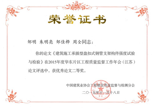 由中國(guó)建筑業(yè)協(xié)會(huì)主辦,江蘇省建設(shè)工程質(zhì)量監(jiān)督總站承辦的2015年度華東片區(qū)工程質(zhì)量監(jiān)督工作年會(huì),于11月19日~20日在蘇州成功舉行。會(huì)前,組織了工程質(zhì)量監(jiān)督管理論文征集評(píng)審活動(dòng),會(huì)上頒發(fā)了優(yōu)秀論文獎(jiǎng)。由無錫前友咨詢檢測(cè)公司撰寫的“建筑施工承插型盤扣式鋼管支架構(gòu)件強(qiáng)度試驗(yàn)與檢驗(yàn)”獲優(yōu)秀論文二等獎(jiǎng),并入選《工程質(zhì)量》雜志。 建筑施工承插型盤扣式鋼管支架近十年的開發(fā)應(yīng)用,已成為一種新型模架體系,應(yīng)用于建筑工程和市政工程中。產(chǎn)學(xué)研團(tuán)隊(duì)先后對(duì)盤扣支架整架性能、節(jié)點(diǎn)構(gòu)件和構(gòu)配件進(jìn)行了大量系統(tǒng)實(shí)驗(yàn)和檢測(cè),旨在科研的基礎(chǔ)上,分列了出廠檢驗(yàn)、型式檢驗(yàn)和見證取樣檢測(cè)相關(guān)要求,為產(chǎn)品出廠檢驗(yàn)和工程現(xiàn)場(chǎng)驗(yàn)收確定檢驗(yàn)項(xiàng)目和判定依據(jù),為建筑施工安全提供技術(shù)保證,并為制訂工程行業(yè)標(biāo)準(zhǔn)和產(chǎn)品行業(yè)標(biāo)準(zhǔn)提供了技術(shù)依據(jù)。 經(jīng)過由無錫速捷腳手架公司、東南大學(xué)、無錫市前友咨詢檢測(cè)公司等單位組成的產(chǎn)學(xué)研團(tuán)隊(duì)歷經(jīng)近十年的不斷深入的研發(fā)創(chuàng)新和全國(guó)大量建筑、路橋、軌道交通等重點(diǎn)工程成功應(yīng)用,承插型盤扣式鋼管支架產(chǎn)品品質(zhì)和應(yīng)用技術(shù)已趨成熟,其支架具有的施工安全可靠度高、承載力大、施工工期短、現(xiàn)場(chǎng)文明美觀等優(yōu)點(diǎn)已被行業(yè)所認(rèn)同,并成為高大結(jié)構(gòu)支模的首選。承插型盤扣式鋼管支架構(gòu)件已列入住建部建筑業(yè)10項(xiàng)新技術(shù)。中華人民共和國(guó)行業(yè)標(biāo)準(zhǔn)《建筑施工承插型盤扣式鋼管支架安全技術(shù)規(guī)程》(JGJ231-2010)已由國(guó)家住建部于2010年11月17日發(fā)布,2011年10月1日起實(shí)施??梢?,該技術(shù)在推廣應(yīng)用時(shí)已有相應(yīng)標(biāo)準(zhǔn)要求可參照。并且,相關(guān)產(chǎn)品的行業(yè)標(biāo)準(zhǔn)《承插型盤扣式鋼管支架構(gòu)件》也已完成送審稿。 為助推新型腳手架技術(shù)的推廣應(yīng)用,確保安全施工,無錫市前友咨詢檢測(cè)公司積極創(chuàng)造條件,取得了鋼管扣件、承插型盤扣式鋼管支架第三方見證取樣檢測(cè)的資質(zhì),并已在無錫市建設(shè)工程安全監(jiān)督站備案。