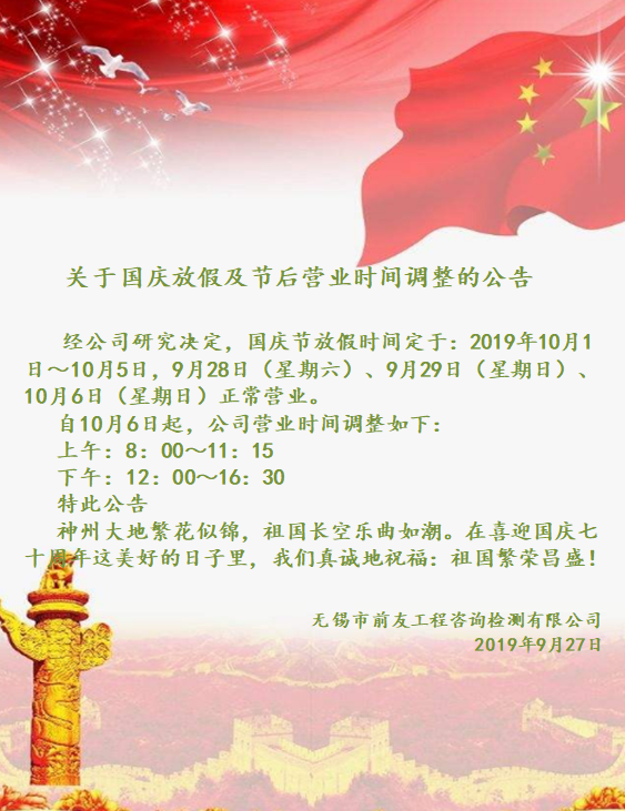 | 關(guān)于國慶放假及節(jié)后營業(yè)時間調(diào)整的公告 | ||