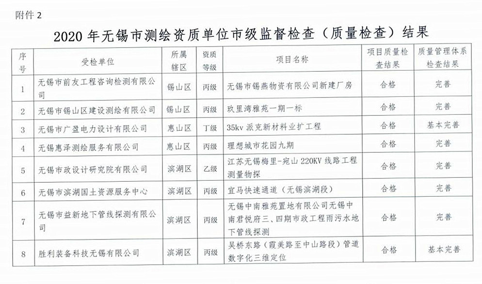 | 2020年無錫市測(cè)繪資質(zhì)單位市級(jí)監(jiān)督檢査結(jié)果出爐 | ||