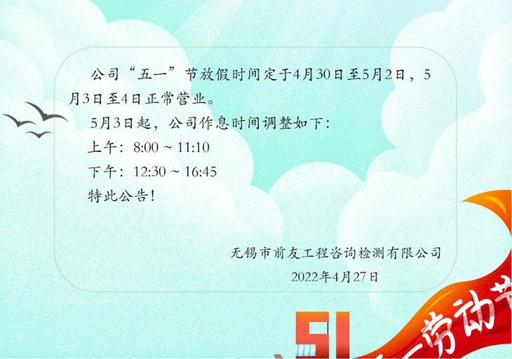 | 關于“五一”勞動節(jié)放假及節(jié)后營業(yè)時間調(diào)整的公告 | ||