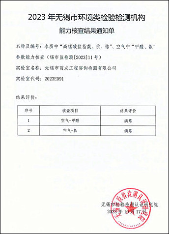 為加強對我市資質(zhì)認定檢驗檢測機構(gòu)的事中事后監(jiān)管,提升檢驗檢測機構(gòu)技術(shù)能力水平,參照《檢驗檢測機構(gòu)監(jiān)督管理辦法》相關(guān)規(guī)定,無錫市市場監(jiān)督管理局于9月份在全市資質(zhì)認定檢驗檢測機構(gòu)中開展市環(huán)境類檢驗檢測項目能力核查工作。 本次能力核查工作委托無錫市檢驗檢測認證研究院為技術(shù)支持單位,負責能力核查作業(yè)指導書制定、樣品準備、結(jié)果匯總、統(tǒng)計分析等工作。能力核查項目為空氣中 “甲醛、氨”等檢測參數(shù)。 無錫市前友工程咨詢檢測有限公司在規(guī)定時間內(nèi)完成了各項檢測工作,并遞交了相關(guān)結(jié)果報告。近日,公司收到“2023年無錫市環(huán)境類檢驗檢測機構(gòu)能力核查結(jié)果通知單”公司參加的空氣中“甲醛、氨”參數(shù)能力核查結(jié)果均為滿意。